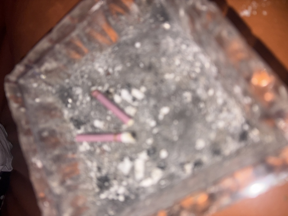 - "This image depicts a rectangular, clear glass ashtray filled with a significant amount of white and grey ash and several black remnants of burnt material" by FM-WfMKz1, licensed under CC BY 4.0