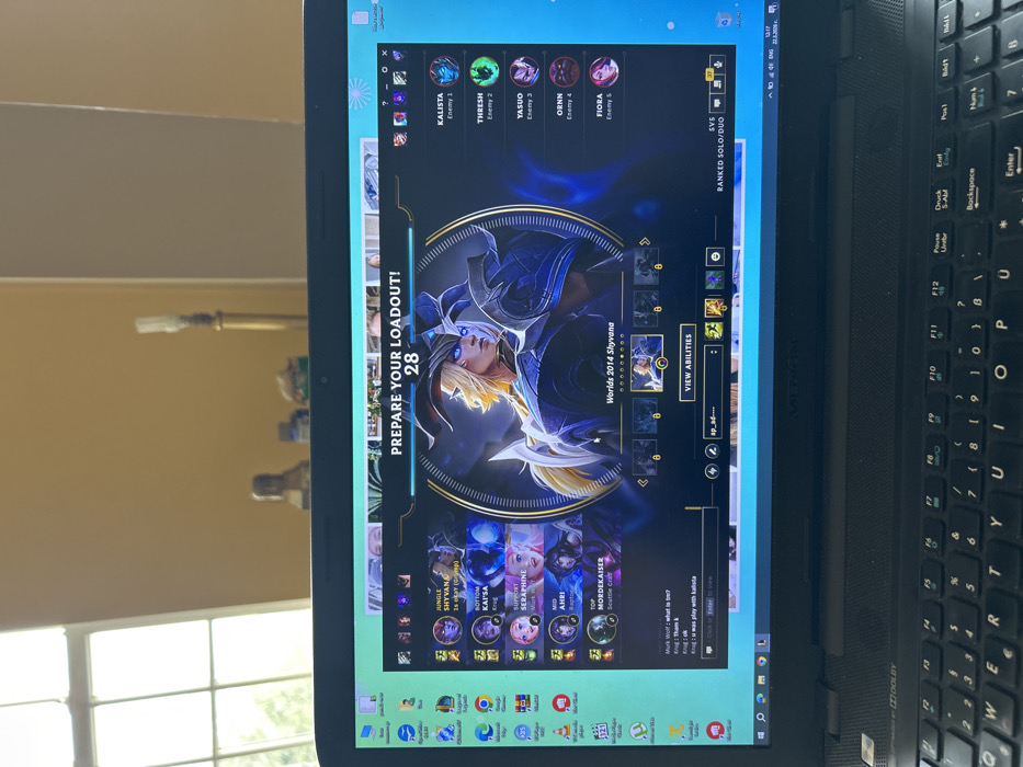 The scene depicts an indoor environment, specifically a room in the city of Aughrim, Ireland. A black Medion laptop is positioned in the foreground, displaying the user interface of the "League of Legends" video game. The screen shows a "PREPARE YOUR LOADOUT!" phase with a 28-second countdown. The central image on the screen is the champion Shyvana in her "Worlds 2014 Shyvana" skin, depicted as a blonde, blue-eyed armored figure. On the left side of the game interface, the player's team composition is listed: JUNGLE Shyvana, BOTTOM Kai'sa, SUPPORT Seraphine, MID Ahri, and TOP Mordekaiser. A chat window at the bottom left displays text messages including "Mark Wolf : what is tm?", "Krug : Tham k", and "Krug : U was play with kalista". The right side of the game interface lists the enemy team: KALISTA, THRESH, YASUO, ORNN, and FIORA. The game mode is identified as "5v5 RANKED SOLO/DUO". The Windows taskbar is visible at the bottom of the laptop screen, indicating the time as 13:47 and the date as 23.3.2023, with the language setting as "ENG". The laptop's keyboard, featuring a QWERTY layout with a large L-shaped Enter key, is visible below the screen. The "DOLBY" logo is present on the laptop's palm rest. In the background, above the laptop, a light-colored wall is visible. To the upper left, a large window with white framing shows an outdoor view of green foliage. On a surface in the mid-background, multiple objects are discernible: a dark, possibly metallic, humanoid figurine or statue resembling a helmeted character, a smaller dark object to its right, and a tall, thin, light-colored object, possibly a lamp or decorative item, positioned further back. No individuals are present in the image.