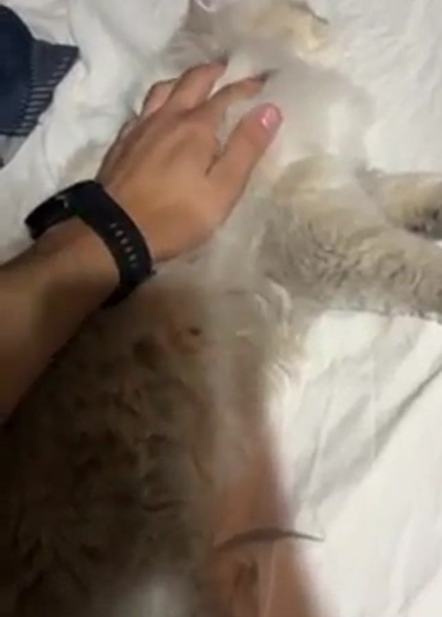 A person's hands are shown petting a fluffy cat lying on its back on a white bed. The person is wearing a black smart watch. The cat's fur is a mix of white, gray, and brown.