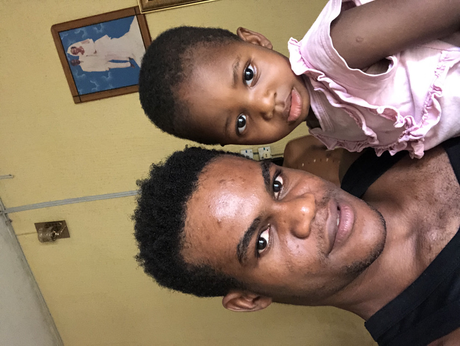 A man with dark hair and a black tank top poses with a baby wearing a pink dress. The baby rests on the man's shoulder, both looking at the camera with slight smiles. The man has dark eyes and brown skin. The background features a yellow wall with a framed picture depicting a couple in white attire. An electrical outlet is visible on the wall as well.