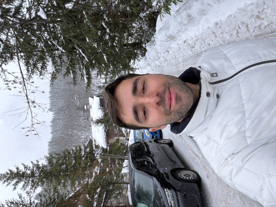 An adult male stands in the foreground, facing the camera, presenting a faint smile. He has dark hair, light stubble, and wears a white puffer jacket with a dark collar. Snowflakes are visible on his hair and jacket. He is positioned on a snow-covered road or path, with snowdrifts piled high on the right side. In the mid-ground, a black panel van is parked on the left side of the road, partially obscuring a blue compact car parked behind it. Beyond the vehicles, several traditional-style buildings, identified as chalets or houses with snow-covered roofs, are visible amidst evergreen trees. The background features a dense, snow-covered forest extending up a hillside under an overcast sky. The scene depicts a winter environment in Les Allues, France, characterized by extensive snow coverage on the ground, trees, and structures.