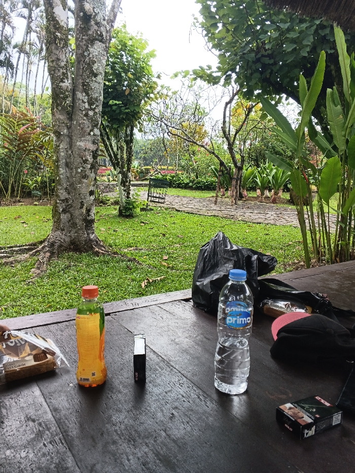 A wooden table holds various items in a garden setting. A package of snacks, an orange juice bottle, a small black box, and a water bottle are neatly arranged. Next to these, a black bag and scattered items, including a cigarette pack, add clutter. The background features a lush garden with trees, green grass, and a stone path leading to distant flower beds and a bench. Tall plants stand near the table, blending the scene with the natural environment.