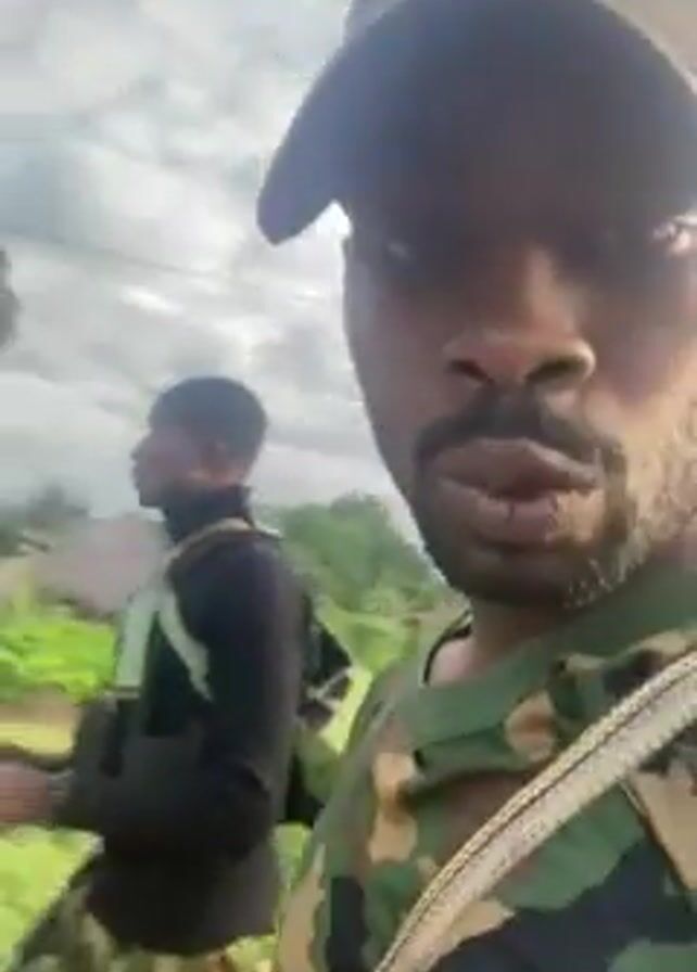 The video features three men walking in what appears to be a rural area. The man closest to the camera is wearing a camouflage shirt and cap, with a strap across his chest. He is looking directly at the camera. Behind him, two other men are walking. One is wearing a black shirt, camouflage pants, and a vest, and is carrying a rifle. The third man is wearing a yellow shirt. The background includes greenery, houses with straw roofs, and a cloudy sky. The video is shot in a handheld style, suggesting the person filming is walking along with the group. The background music is audible.