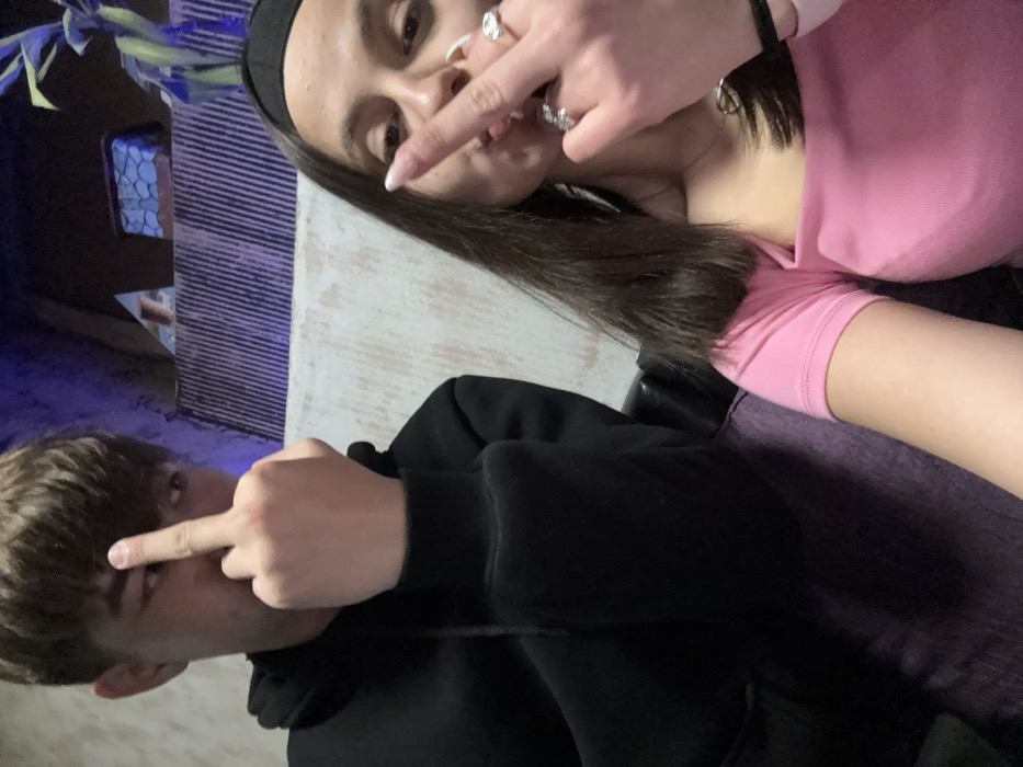 The image captures two individuals, one male and one female, seated in a dimly lit indoor setting in Radomir, Bulgaria. Both are facing the camera, with each raising a hand to display the middle finger in a gesture of defiance. The male, positioned on the left, has short brown hair and wears a black hooded sweatshirt; his right hand is raised, partially obscuring his face. The female, positioned on the right and closer to the foreground, has long dark hair, wears a black headband, and is dressed in a pink short-sleeved top with a square neckline. Her left hand, adorned with several rings and light-colored nail polish, is raised towards her face. The background consists of a light-colored wall segment topped by a darker area featuring vertical textured paneling and abstract decorative elements, including a plant illuminated with a blue-purple light. The overall ambiance is subdued, with artificial lighting accentuating specific background features.