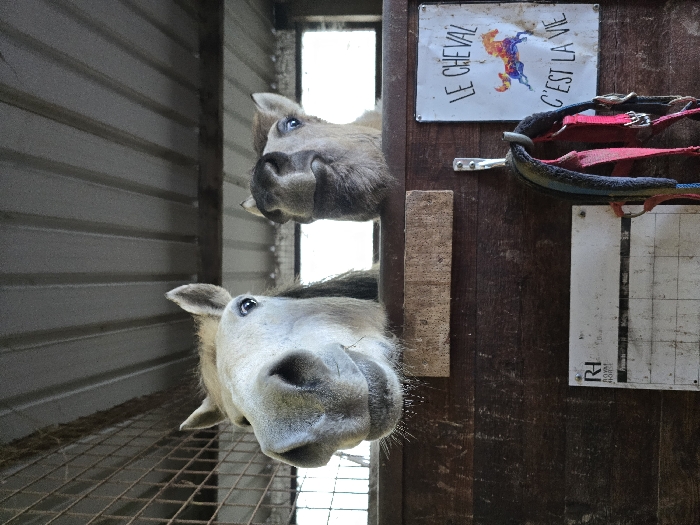 Two horses peek out of their stalls. One is gray, and the other is brown. They both have large noses and small eyes. Behind them is a metal mesh. To the right, a wooden wall has a sign that reads "Le Cheval C'est La Vie" with a colorful horse illustration. A red harness hangs below the sign. A rectangular white card with black lines and markings is mounted to the wall, along with a small block.