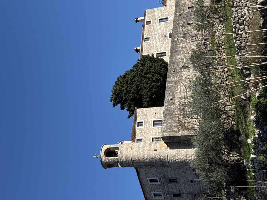 The image depicts the Podostrog Monastery complex situated on a hillside in Podostrog, Montenegro. The primary structure is composed of multiple buildings constructed from light-colored cut stone, featuring reddish-brown tiled roofs. A cylindrical stone bell tower, capped with a white cross, is prominently positioned on the left, displaying arched openings through which a bell is visible. Numerous rectangular windows with dark frames are present across the stone facades. Multiple stone chimneys with terracotta caps are visible on the roofs of the buildings to the right. The monastery sits atop a series of terraced slopes, defined by dry-stacked stone walls. The foreground and midground display a hillside with olive trees, sparse green vegetation, and numerous dry, thin stalks. A large, dark green coniferous tree is located directly behind the central monastery structures. The scene is illuminated by direct sunlight under a clear, deep blue sky. No individuals, animals, or active elements are present in the frame.