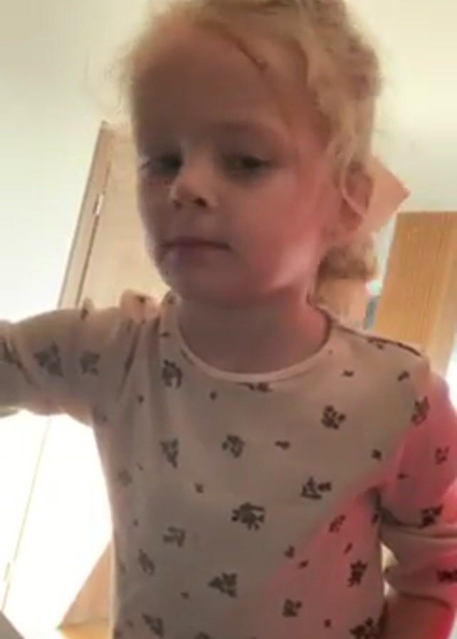 A young girl with light blonde hair in a ponytail with a pink bow stands in front of the camera, wearing a long-sleeved shirt with small dark floral prints. She looks to the side, then directly at the camera. She makes an uncertain facial expression and then looks upward to the left. A wooden door is visible in the background. The lighting is bright and casts a pink hue on the girl.