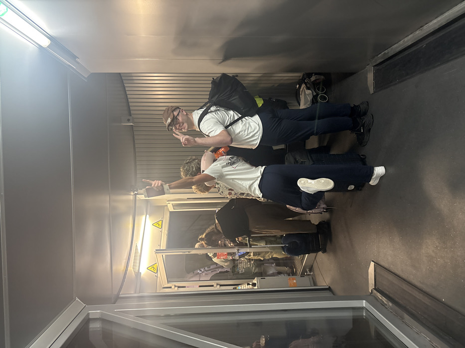 Two young men pose in a corridor. The first man wears a hat, a backpack, and gives a peace sign. The second man points. Both wear white shirts and dark pants. Other people stand behind a glass partition to the left, where warning symbols are visible. Luggage is scattered on the corridor floor. The space appears to be an airport or train station.
