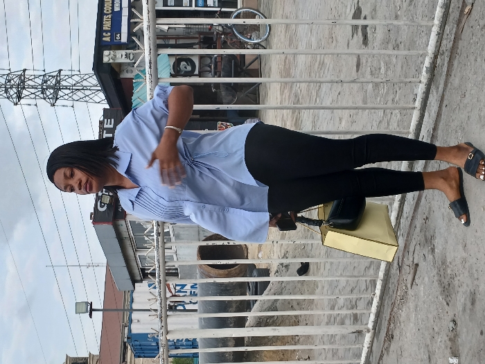 An adult female is depicted standing outdoors behind a white metal fence, on what appears to be a paved or concrete surface in the city of Ikota, Nigeria