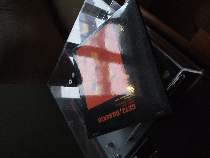 This image depicts a static indoor scene, reportedly located in Tel Aviv, Israel. The central subject is a black vinyl record album, titled "GETZ/GILBERTO" in orange lettering, with additional text identifying "STAN GETZ," "JOAO GILBERTO," and "ANTONIO CARLOS JOBIM." The album cover features an orange-red rectangular block with abstract yellow shapes on its upper right quadrant. It rests askew on a clear, highly reflective acrylic or glass surface, which appears to be the lid of an audio component, possibly a turntable. Reflections from an ambient light source are prominent on both the album cover's glossy finish and the transparent surface. The background consists of a dark, indeterminate fabric or upholstered surface in the upper left, and a darker, polished wooden surface in the lower right. No human subjects or actions are depicted.