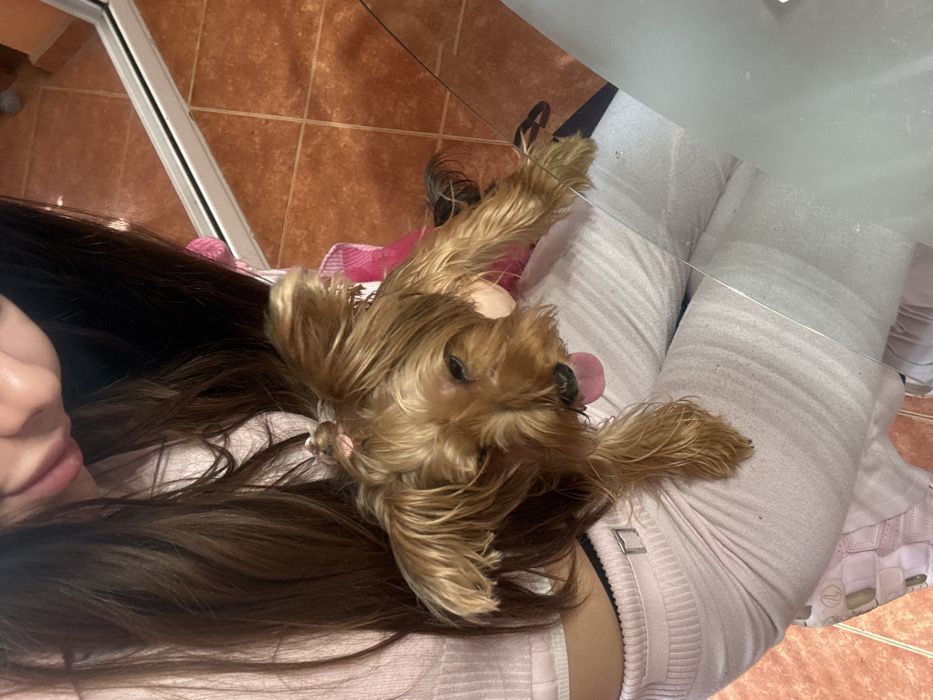 The scene depicts an individual indoors, holding a small dog. The person's lower face, including the chin and mouth, and long dark brown hair are visible in the upper frame. They are dressed in a light pink ribbed crop top and matching ribbed sweatpants, which feature a black waistband and a silver-toned buckle on the left hip. Resting in the person's lap is a small Yorkshire Terrier-type dog with tan and dark brown shaggy fur, floppy ears, and a pink bow adorning the top of its head. The dog's tongue is slightly extended. A clear glass tabletop occupies the lower right and central foreground, reflecting portions of the dog and the person's attire. A frosted glass panel is visible on the far right. The background features an orange-brown tiled floor with dark grout lines and a white-framed window or door in the upper right. This indoor setting, located within Sofia, Bulgaria, lacks specific landmarks to pinpoint an exact address or district.
