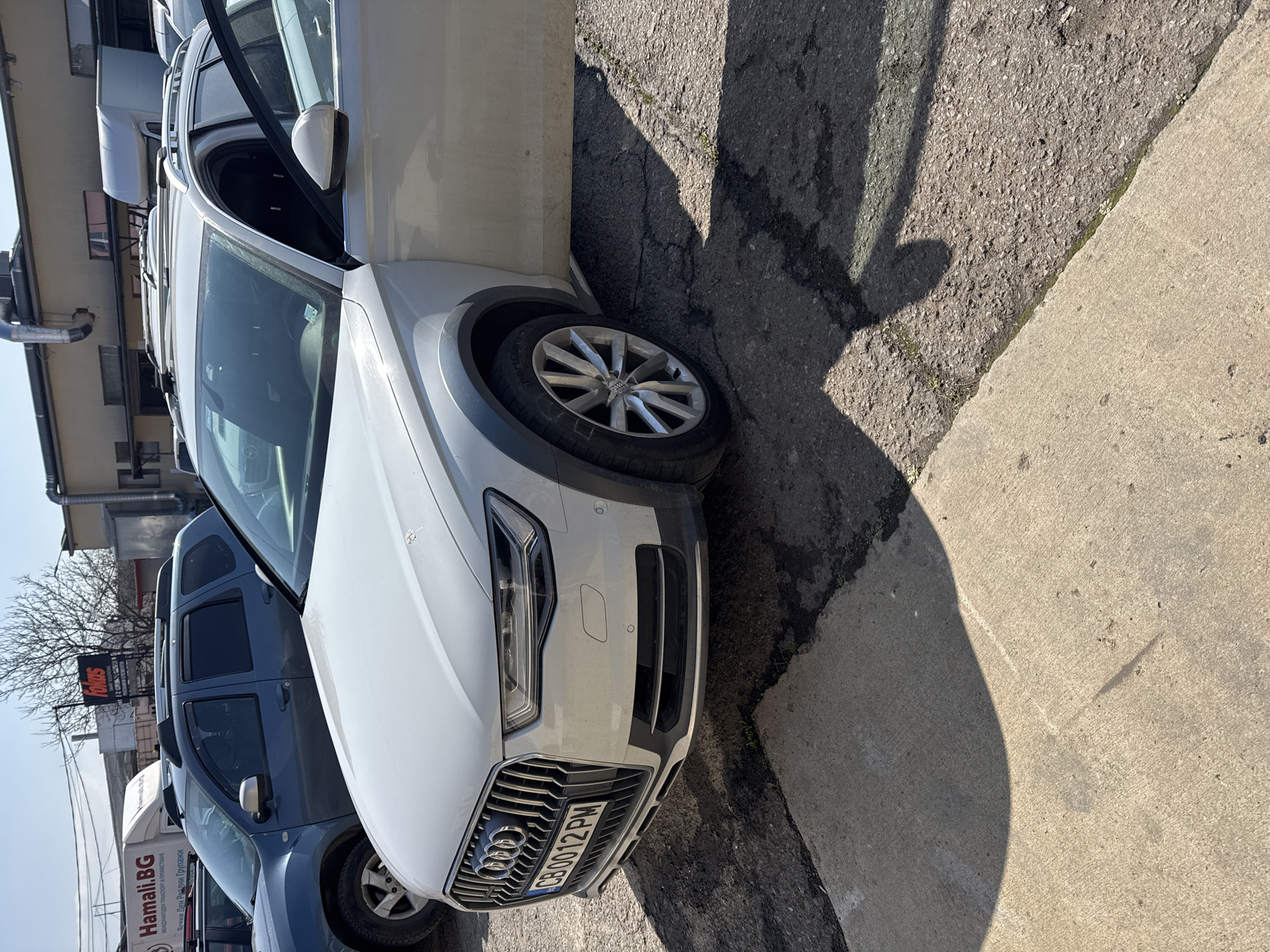 The image depicts an outdoor parking area in Kazichene, Bulgaria, under clear daylight. A white Audi Allroad, bearing Bulgarian license plate CB0012PM, is prominently parked in the foreground with its front passenger door open. The vehicle's exterior shows signs of dirt accumulation. Behind it, a blue Dacia Duster with roof rails is parked. Further in the background, a white truck/van with "Hamali.BG" and Cyrillic text related to international transport is visible. The ground surface is a mix of cracked asphalt/gravel and concrete slabs, with small patches of green vegetation emerging from cracks. Industrial-style buildings are present in the background, one featuring a sign that includes "Fokas" and "ПЕЧАТНИ РЕКЛАМИ" (PRINT ADVERTISING) in Cyrillic, along with external metal ductwork. Overhead power lines are visible against a clear blue sky. Strong sunlight casts distinct shadows across the parking surface. No individuals are visible in the scene.