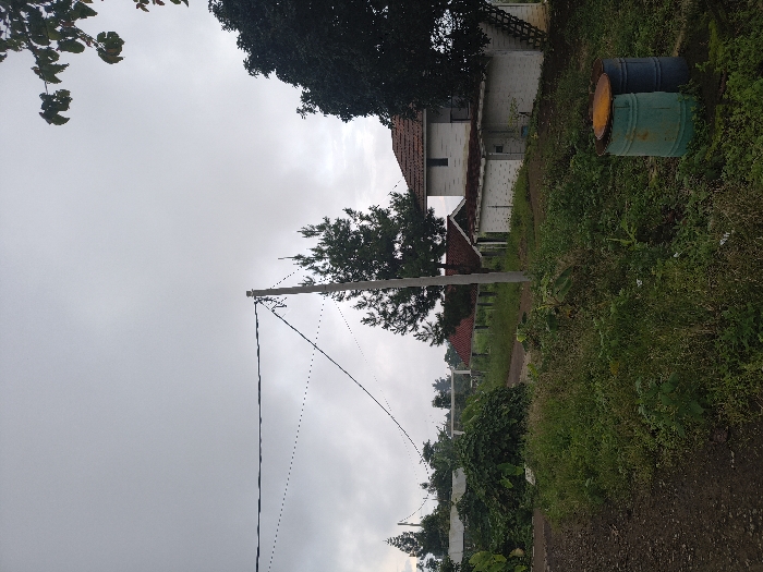 The scene depicts a semi-rural outdoor environment within An Khe Ward, Vietnam, under an overcast sky. In the foreground, a dark dirt path runs along the left, transitioning into an area of overgrown green grass and weeds covering the ground. Two metal barrels are positioned on the right side of the foreground, one teal and one dark blue, with a rusted yellow lid on top of the teal barrel and part of another lid visible on the blue one. Midground elements include a wooden utility pole positioned centrally, supporting multiple dark electrical or communication wires extending across the frame, with some wires having dotted patterns due to partial obstruction or depth. Various trees are scattered throughout the midground and background; a prominent evergreen tree resembling a pine is visible to the right of the utility pole. Further left, a dense cluster of broadleaf vegetation borders the dirt path. In the background, a cluster of buildings is visible, primarily a white two-story structure with a reddish-brown tiled roof on the right. An external wooden ladder ascends the right side of this white building. Adjacent to it are smaller, white single-story structures also featuring reddish-brown tiled roofs. A fence line or partial wall can be seen in front of these buildings. The horizon reveals additional trees and distant structures, indicating a populated but green area. No people are visible within the frame, and no specific actions or interactions are depicted.
