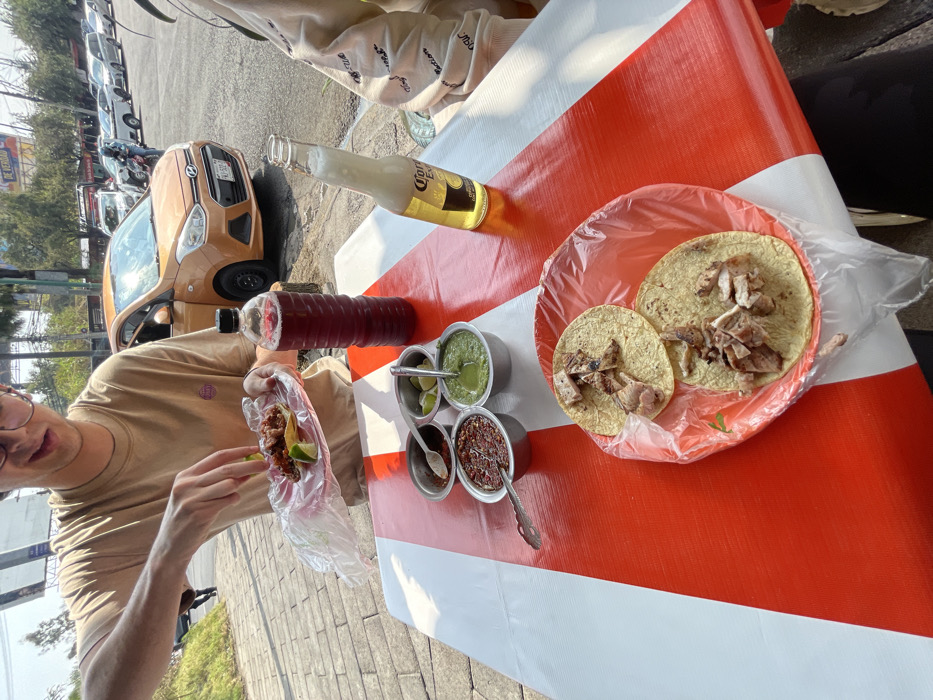A table with an orange and white striped tablecloth holds a bottle of Corona, a tall beverage in a clear container, several metal bowls with various salsas and lime wedges, and a plastic plate with two tacos. A person wearing a tan shirt and glasses is holding a taco in a plastic bag, squeezing a lime wedge over it. A brown car is parked in the background, with other vehicles visible in the distance. The scene appears to be an outdoor meal at a street food vendor.