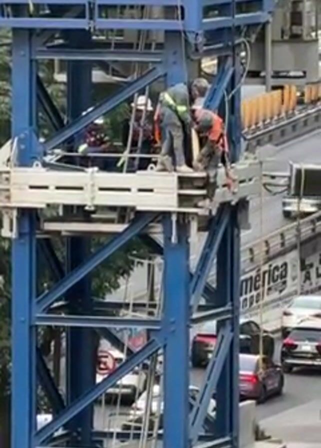 The video depicts several people on a blue metal tower-like structure, possibly a crane. One person, wearing a safety harness and orange vest, is standing at the edge of a platform, seemingly working on something. Another person, wearing a green vest, is also attending to the task. Several other people in dark uniforms are standing in the center of the platform, presumably overseeing or assisting. The structure is located near a busy road with cars moving below. The environment seems to be an urban area with trees and buildings visible in the background.