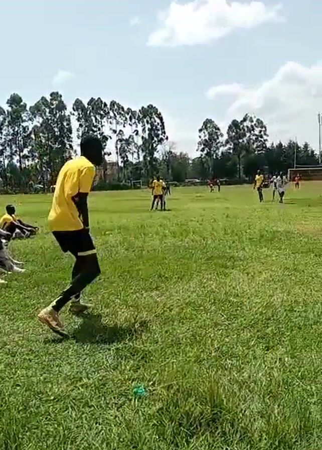 soccer game being played on a grassy field. Several players wearing yellow and white shirts are visible. A player wearing yellow falls after colliding with a player in white, who then gains possession of the ball. Some individuals are sitting on the sidelines watching the game. The background features trees and a cloudy sky. A soccer goal is visible in the distance.