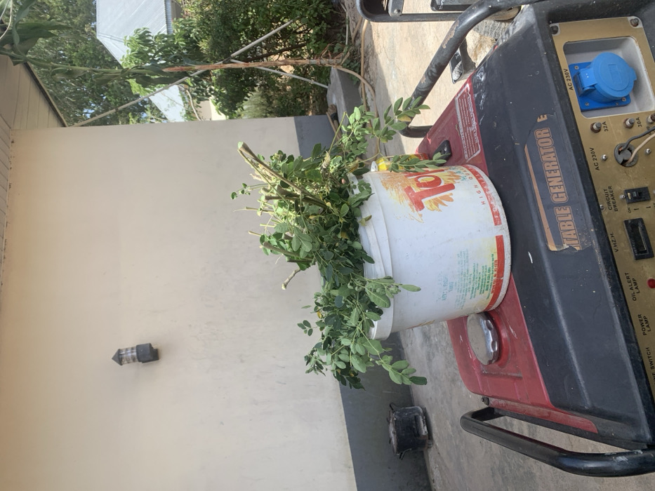 A white plastic bucket, filled with green leafy branches, rests atop a red and black portable generator