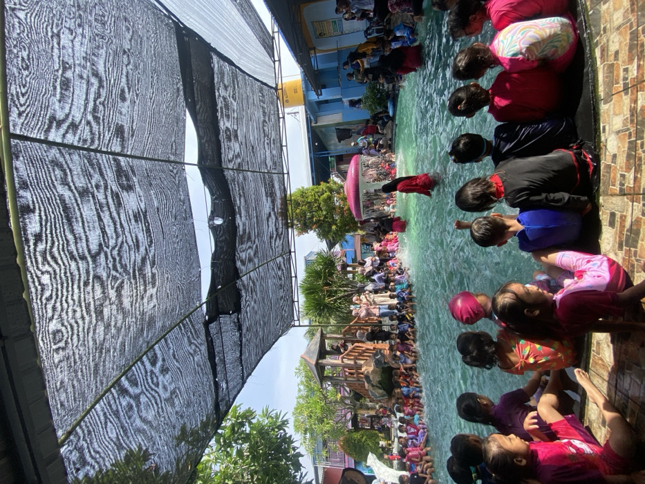 A large group of children sits along the edge of a pool, some with their feet in the water. The pool area includes a structure resembling a gazebo and various plants. Above, a black shade cloth provides cover from the sun. In the background, adults stand watching. Some people are in the pool itself. The scene is outdoors, likely at a swimming facility for kids.