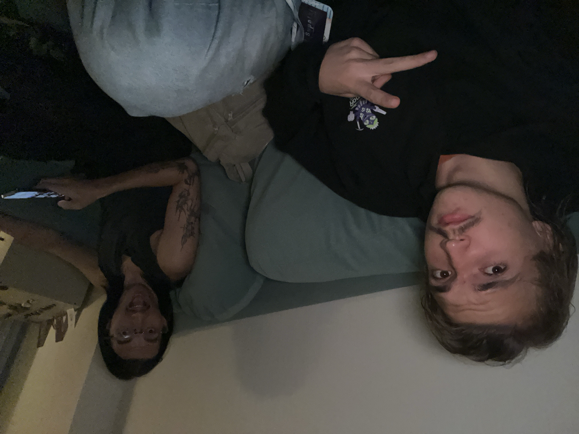 Two adult males are depicted seated on a light blue-green upholstered sofa in an interior setting within Samrong Nuea Subdistrict Municipality, Thailand. The male on the left has light brown hair and a mustache, wearing a black hooded sweatshirt with a colorful graphic on the left chest and light blue jeans. He is looking towards the camera, displaying a "V" or peace sign with his right hand. The male on the right has long dark hair and glasses, wearing a dark sleeveless top and dark pants. A dark tattoo is visible on his right upper arm. He is looking towards the camera with an open-mouthed expression, holding an illuminated smartphone with both hands. A tan bag is partially visible between the two individuals on the sofa. To the right of the male with long hair, a light-colored surface with indistinct objects is visible. The scene is dimly lit.