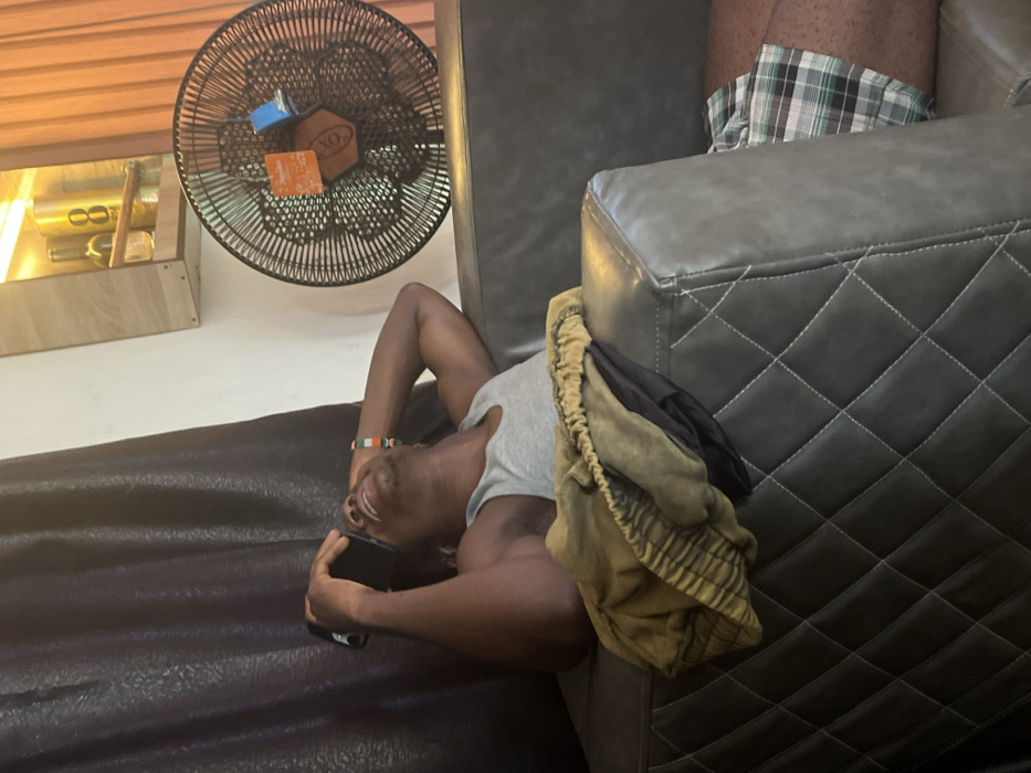 In Ikot Ekpene, Nigeria, a single adult male is depicted indoors, reclining on a dark grey, quilted leatherette sofa
