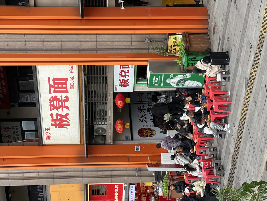 - "A bustling street scene shows a row of people seated on red plastic stools, eating at an outdoor eatery" by FM-jql2J3, licensed under CC BY 4.0