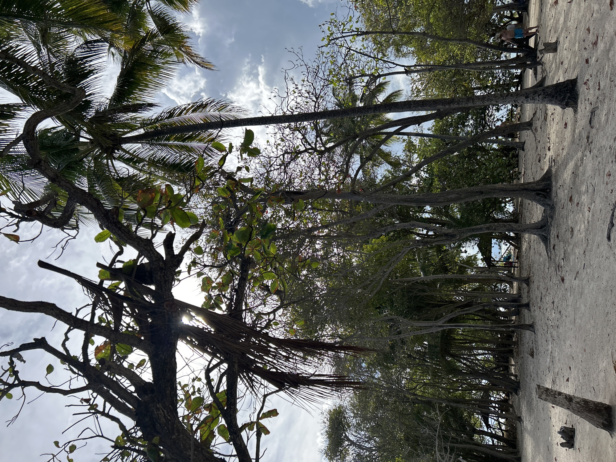 A view of the beach in Le Gosier, France, shows a row of trees and palm trees lining the sandy area. Some people are present in the background. The perspective is from below, looking up through the branches towards the sky, which has scattered clouds. The sun is partially obscured by the foliage, creating a contrast of light and shadow.
