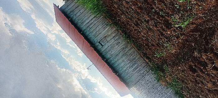 This image, taken in Kinale ward, Kenya, depicts an outdoor agricultural scene. The photograph is oriented diagonally, with a bright, partly cloudy sky occupying the upper left quadrant. A prominent, weathered wooden building with vertical planks and a red corrugated metal roof extends diagonally across the mid-ground. A small, dark, rectangular opening is visible on the building's side. A metallic pole with a support structure projects from the roofline. To the immediate left, a portion of a second, similar wooden structure is visible. The foreground and lower right consist of dark brown, freshly tilled soil, interspersed with scattered small green plant sprouts and patches of green grass along the building's base. No individuals or specific actions are visible.
