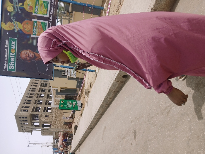 The scene depicts an outdoor urban environment in Kadoma, Zimbabwe, on what appears to be a clear, bright day. In the foreground, a female subject walks towards the left, her right side partially visible. She wears a full-length, rose-pink garment, possibly an abaya or jilbab, with a matching hijab covering her head. A light green face mask is positioned under her chin. Her right hand holds a light-colored mobile phone to her ear, and a ring is visible on her right ring finger. She wears dark shoes. Immediately behind her on the right is a large billboard advertising "Shaltoux," a product for natural sore throat relief, displaying "Think Natural, Think Shaltoux." The billboard features a smiling male figure and images of orange and lemon flavored product packaging. In the mid-ground to the left, a multi-story, partially constructed building stands. It shows exposed concrete framework and uncompleted brick infill walls on its lower levels. Utility poles with overhead wires are visible near this building. Further along the street on the left, other individuals are present, and what appears to be a large, horizontal cylindrical tank on a vehicle or trailer is discernible. A green sign on a pole is also visible near the street. The ground consists of a paved road with a concrete curb separating it from an unpaved or partially paved area. The sky above is clear and light.
