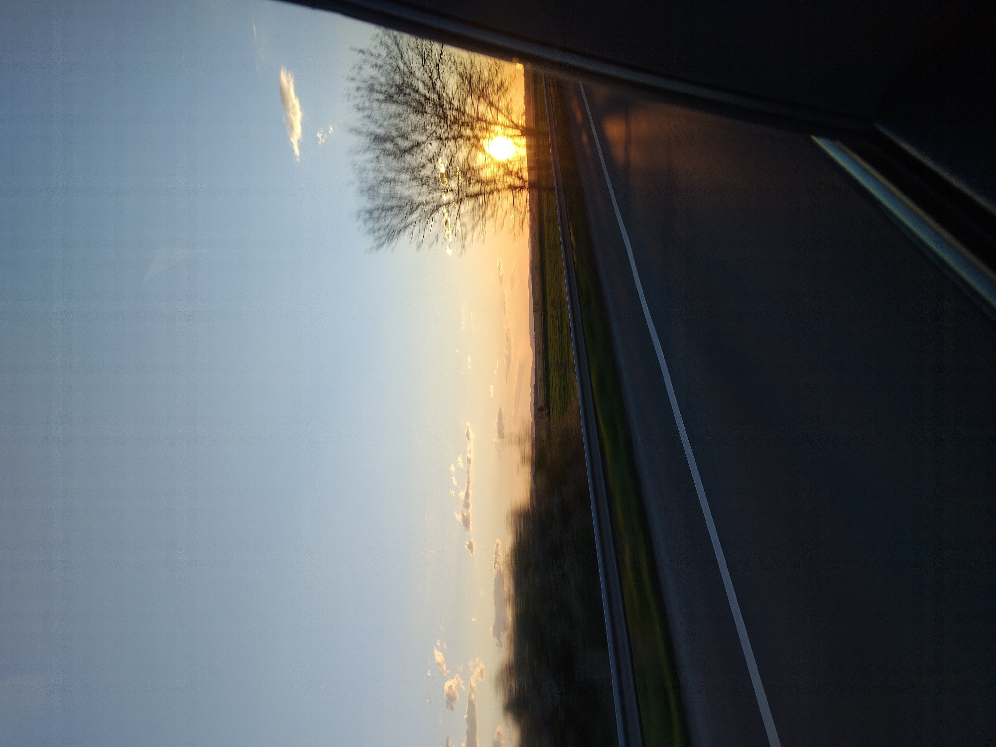 A view from a car window at sunset shows a rural landscape. A road runs horizontally across the right side of the frame, marked with a white line. To the left of the road is a field that fades into a treeline silhouette as the sun sets. The sun is visible through the branches of a bare tree in the distance. The sky transitions from blue to orange near the horizon. The car window frame is visible on the right side of the image. The location is unknown.