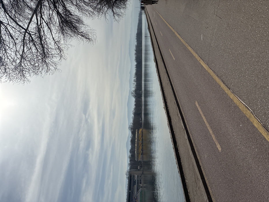 The image presents a wide view of the Plovdiv Rowing Canal in Plovdiv, Bulgaria, under an overcast or hazy sky. In the immediate foreground, a paved asphalt pathway, featuring a solid yellow line on its left edge and a broken yellow line further right, extends from the lower right corner towards the center horizon. To the left of this pathway, a narrow concrete curb separates it from the calm surface of the canal, which occupies the central and left portions of the midground. On the opposite bank of the canal, situated in the far left midground, are two distinct stadium structures: one with green seating visible on its upper level, and another with bright yellow seating. A dense line of deciduous trees, currently bare of leaves, borders the far bank of the canal and extends towards the hazy horizon. Beyond these trees, a faint, layered range of hills or mountains is visible in the distant background. In the upper right quadrant of the image, the intricate network of bare branches from a large tree extends into the frame. On the paved pathway, in the right midground, a single individual wearing a light-colored coat walks away from the camera. Further along the pathway, several other indistinct human figures are visible. A small white buoy or marker floats on the canal's surface in the right mid-distance.