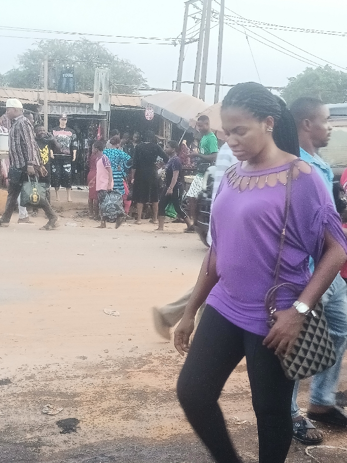 A woman in a purple top and black leggings walks on a dirt road, carrying a patterned bag and wearing a watch. Behind her, a bustling market scene unfolds with vendors, shoppers, and mannequins displaying clothing. A man in a striped shirt walks in the opposite direction, carrying a bag. Power lines stretch across the sky above the market.