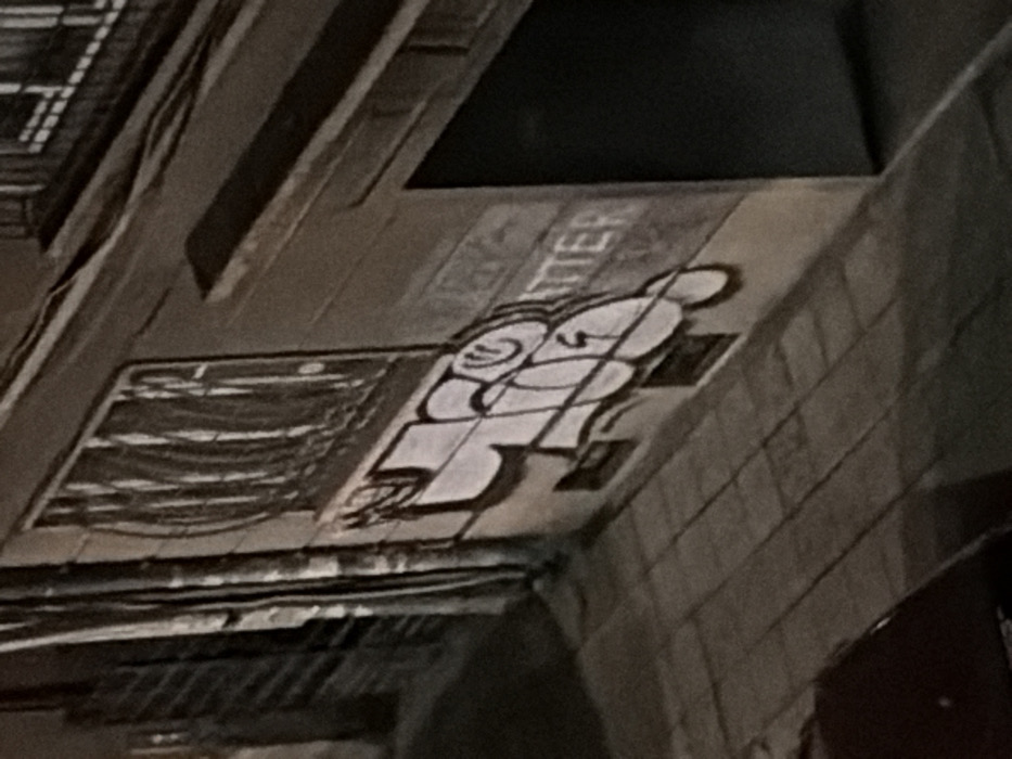 The image depicts a nighttime urban scene in Sofia, Bulgaria, captured from an elevated perspective looking down at a building facade and sidewalk. The primary subject is a light-colored building wall adorned with graffiti. A prominent, stylized white bubble-letter tag with black outlines is centered on the wall, appearing to spell "LOVE" or a similar word, incorporating a small smiling face icon within one letter. To the right of this tag, a lighter, block-letter graffiti segment reading "ITTER" is partially visible. Above the graffiti, a window featuring vertical bars or a decorative grille is present. A vertical drainpipe runs along the left side of the wall. To the upper right, a horizontal concrete ledge protrudes from the facade, and below it, a dark rectangular opening indicates a doorway or entrance. The ground consists of a tiled sidewalk with rectangular paving stones. A dark-colored vehicle, likely a car, is partially visible in the lower-left corner of the frame. The scene is dimly lit, consistent with nighttime conditions. No individuals are visible, and no actions are depicted.