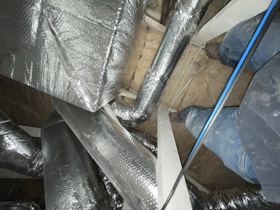 A cluttered crawl space featuring multiple insulated ductwork pieces, some rectangular and some cylindrical, crisscrossing each other. Insulation material lines the space between the wooden beams. A person wearing jeans and brown shoes is partially visible, situated above the crawl space floor. A blue cable and white wires are strung across the scene.