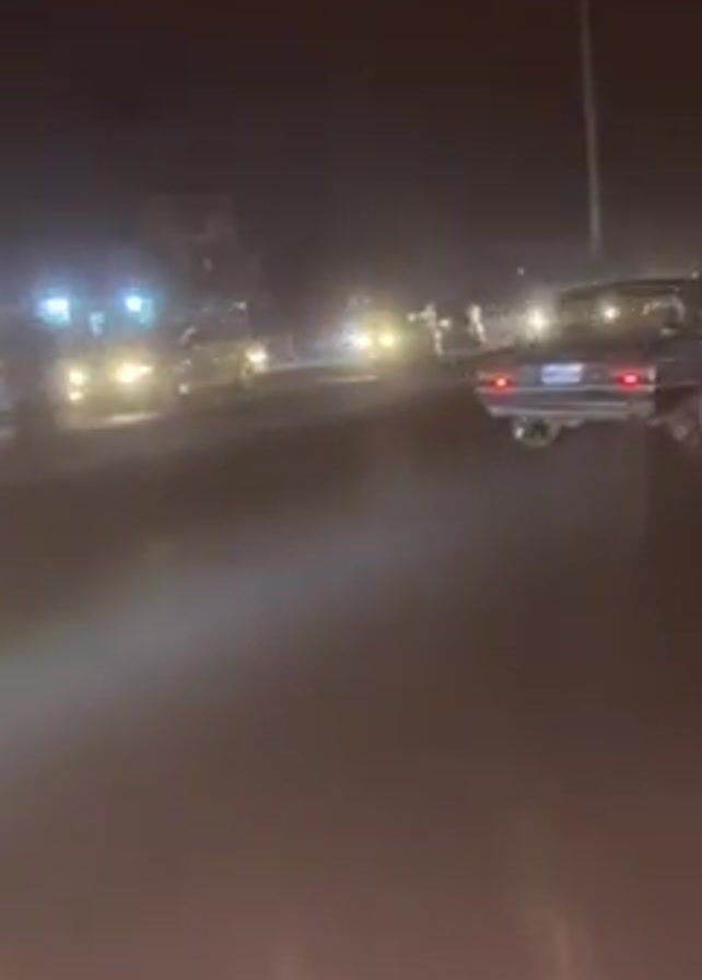 The video depicts a nighttime scene on a road with various vehicles and people visible under streetlights. A car with visible taillights is prominent in the foreground. Other vehicles, including what appears to be a tuk-tuk or auto-rickshaw, are also present on the road. People are standing near the vehicles. The overall environment suggests an urban or populated area at night.