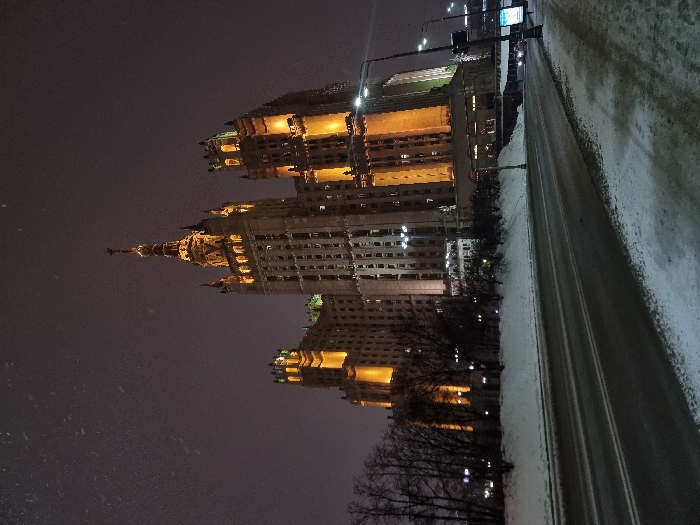 A nighttime view showcases a monumental building illuminated with golden lights. The structure exhibits a tiered design, narrowing as it ascends to a distinct spire. A street runs alongside the building, blanketed with snow. Silhouetted trees line the road. The dark sky contrasts with the building's warm illumination and the snow's stark whiteness. Streetlights add to the overall brightness in the scene.