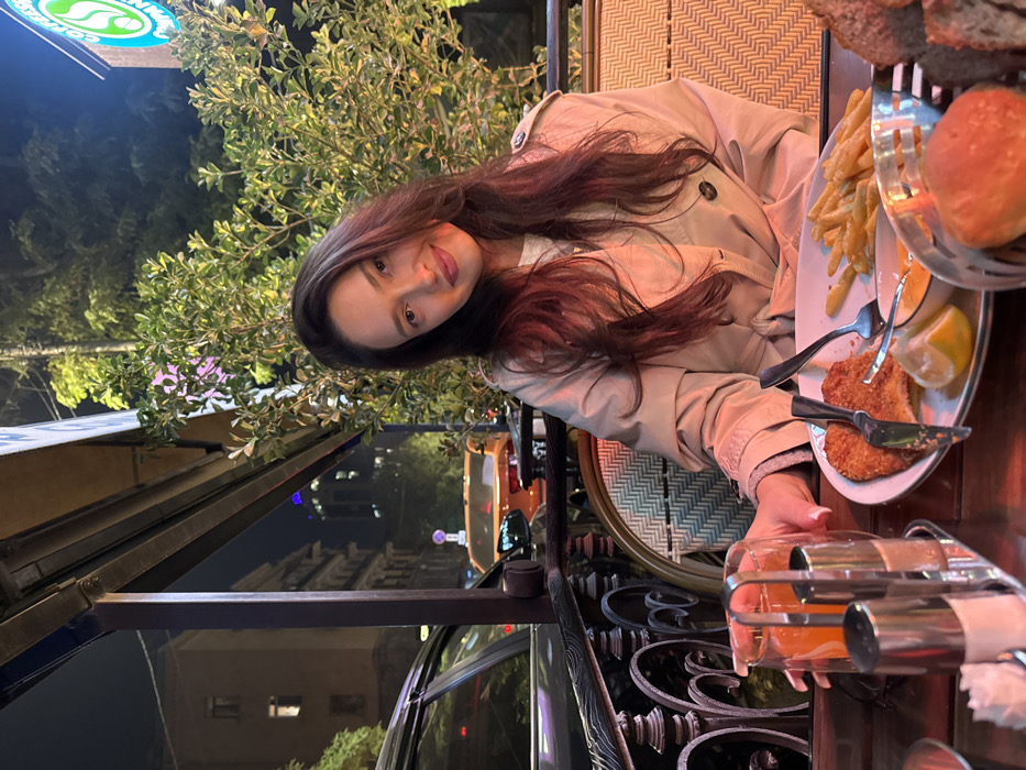 The image depicts an outdoor night scene in Yerevan, Armenia. A female individual with long, dark hair, wearing a light-colored trench coat over a white top, is seated at a dark wooden table, looking towards the camera with a slight smile. Her right hand rests on the table next to a tall glass containing an orange-colored beverage. On the table in front of her, a white oval plate holds two breaded cutlets, a serving of french fries, a lemon wedge, and a small dish of a light-colored dipping sauce. To the right, a silver-colored bread basket contains assorted bread items. A metal condiment caddy with two shakers is also present on the table. The immediate surroundings include an ornate dark metal railing and a wicker-patterned chair. In the background, a city street is visible with a dark sedan and an orange taxi. Multi-story buildings, some with illuminated windows, are present in the distance, including a taller structure with blue illumination. Green foliage is visible behind the seated individual, illuminated by ambient light. A partial blue and green circular sign, featuring the text "Coffee Station," is visible in the upper right background. The scene is illuminated by ambient streetlights and localized cafe lighting.