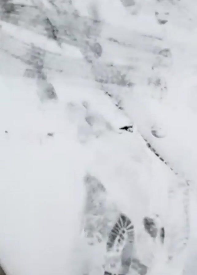 A person wearing white shoes and gray pants walks on a snowy surface, leaving footprints. The camera, positioned at the person's eye level, captures the ground in front of them. Tire tracks are visible in the snow at the start of the video, and a storm drain is seen near the beginning. The person walks along a concrete curb. As the video progresses, a chain-link fence and several cars covered in snow come into view.