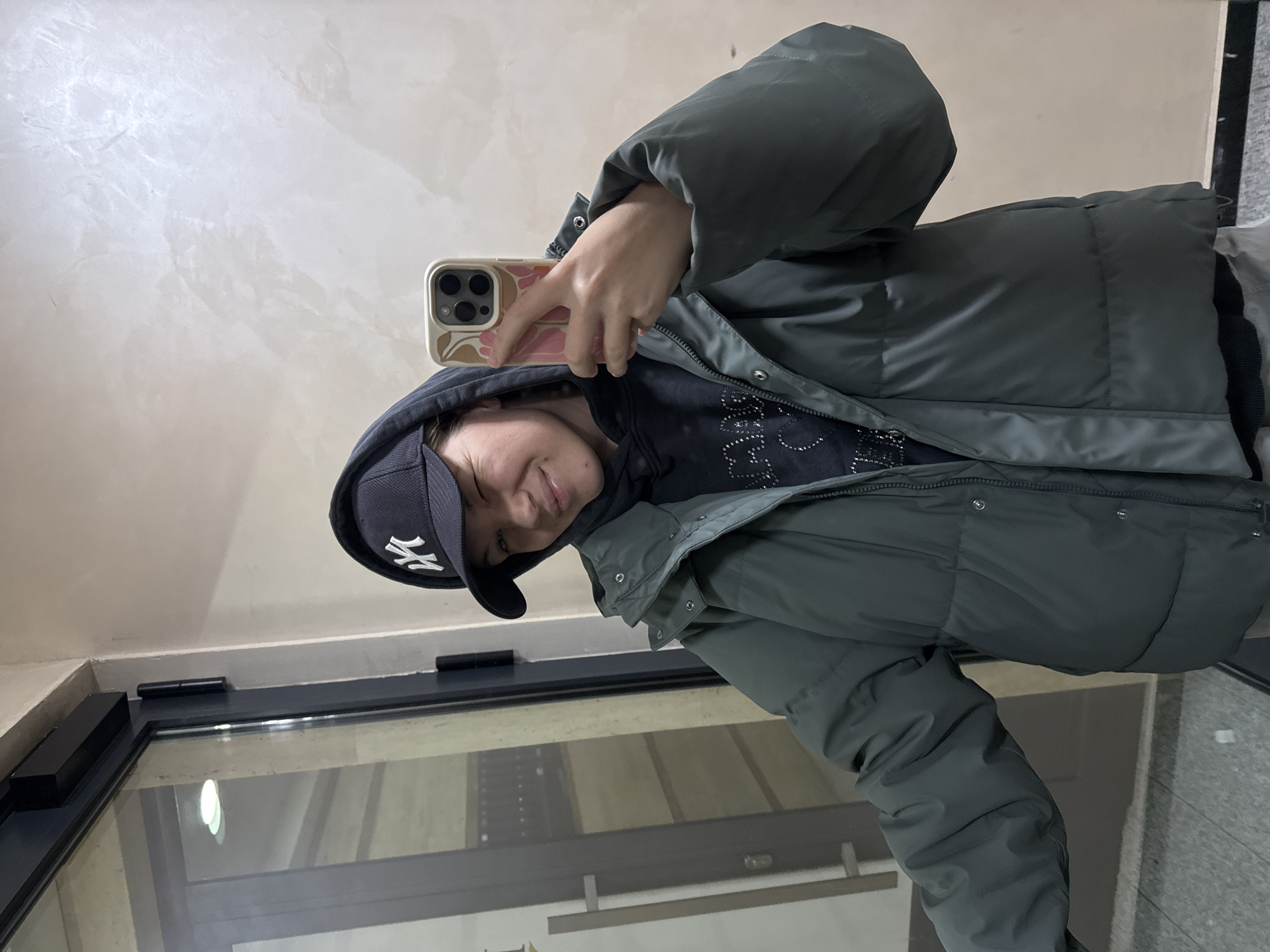 A person is taking a selfie indoors near a doorway or window. The person is wearing a dark-colored baseball cap with a "NY" logo, a hooded sweatshirt, and a green puffer jacket. The person is holding a smartphone with a floral-patterned case. The background consists of a plain wall and a doorway or window with a dark frame. No information about the location being in the city of Vozdovac Urban Municipality, Serbia, is available.