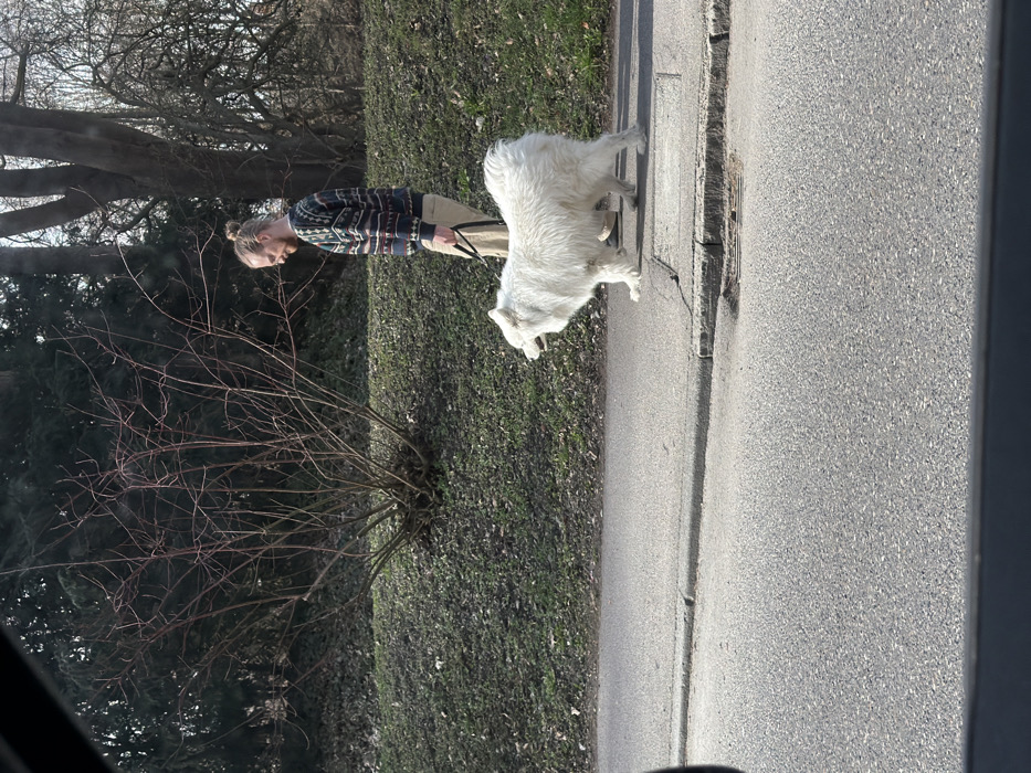 The image depicts an outdoor scene in Neu-Ulm, Germany, with the exact street address undeterminable from the visual information. An adult male is walking a large, fluffy white dog on a leash along a paved sidewalk. **People:** One male individual is present. He has light-colored hair, tied into a top knot, and a beard. He wears glasses, a patterned long-sleeved sweater with multiple colors (including blue, green, and red tones), and light-colored trousers. He is positioned in profile, facing right, looking slightly downwards and forward. His right hand holds a black leash. **Subjects/Objects:** The primary subject, besides the man, is a large white dog with thick fur, possibly a Samoyed or a similar breed. The dog is attached to a black leash held by the man. The dog is also in profile, facing right, with its mouth slightly open. The foreground shows a dark vehicle frame at the bottom and a partial dark frame at the top left, indicating the image was captured from inside a vehicle. The ground immediately beneath the subjects is a grey paved sidewalk, separated from a darker grey asphalt road by a raised curb. A dark metal grate or drain cover is visible in the road surface near the curb. In the background, behind the sidewalk, there is a grassy incline covered with sparse green patches and fallen brown leaves. A prominent, leafless deciduous shrub or small tree with reddish-brown branches is centered in the mid-ground. Further back, a line of deciduous trees with bare branches and some evergreen trees is visible against a bright sky, suggesting daylight. **Actions/Interactions:** The man is walking the dog. Both are moving in tandem from the left side of the frame towards the right along the sidewalk. The man is actively holding the dog's leash. **Environment:** The environment is an urban or suburban setting, characterized by a paved road, a sidewalk, and a natural or landscaped area with trees and grass. The bare trees and sparse ground cover suggest a temperate climate during late autumn, winter, or early spring. The scene is illuminated by natural sunlight, casting no distinct shadows directly towards the camera, suggesting midday or early afternoon.
