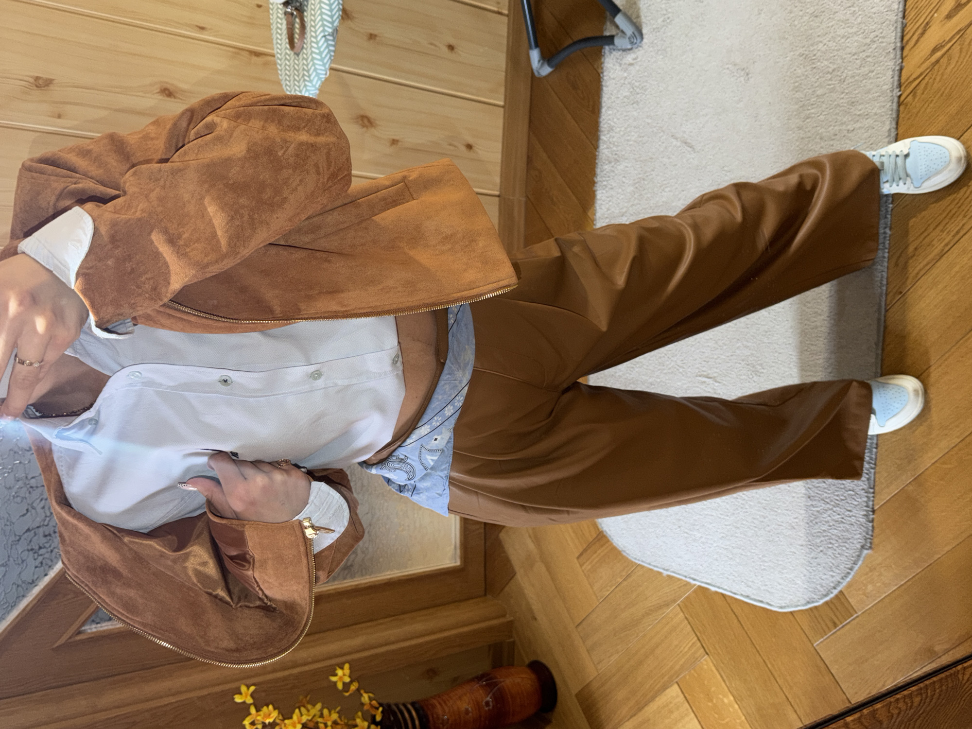 A person is standing indoors on a wooden floor. The person is wearing a brown suede jacket, a white button-down shirt, and brown trousers. They are also wearing light blue sneakers. A patterned blue scarf is visible underneath the jacket. The scene includes a light-colored oval rug, a clothes hanger, a vase with yellow flowers, and a small decorative object on the floor. The location is not specified in the image, and therefore the city of Buhovo, Bulgaria cannot be determined.