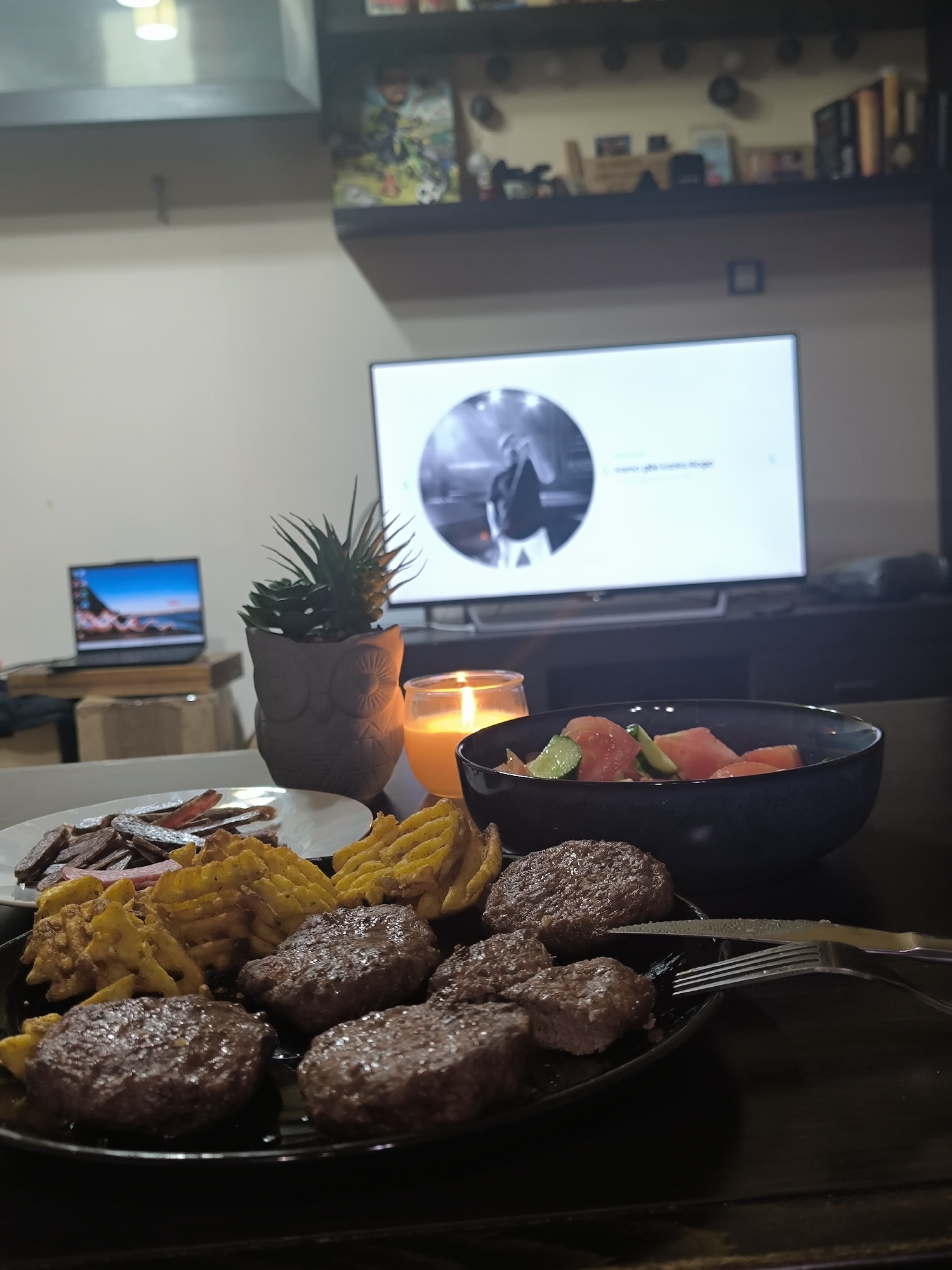 The image depicts an indoor scene, possibly a living room, with a meal displayed on a table. The meal consists of what appears to be ground meat patties and waffle fries on a black plate. A white plate contains slices of sausage. A dark blue bowl holds a salad, possibly with watermelon and cucumber. A lit candle in a glass jar sits between the bowl and a potted plant resembling a succulent. In the background, a laptop sits on a table to the left of a television screen displaying an image and text. A shelf with various objects is visible above the television. There is no specific information in the image to indicate the location as Sofia, Bulgaria.
