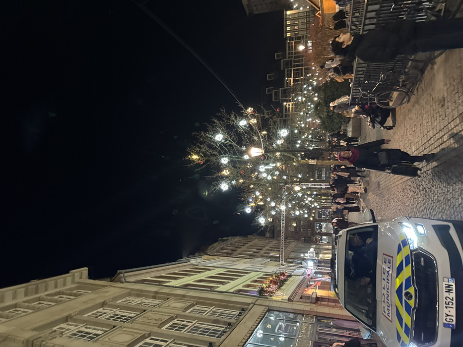 Nighttime scene in a European city. A police car is parked on a cobblestone street. People stroll past lighted trees, and a building with many windows stands on the left. The trees have decorative lights and ornaments. A line of people is seen on the right side of the street near a metal fence. The sky is dark, and an overhead wire is visible.
