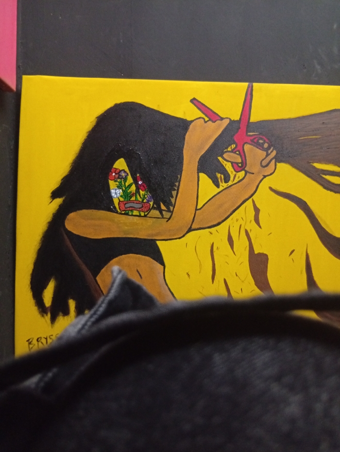 A photograph captures a vibrant painting displayed on a dark surface. The painting, rendered in a stylized manner against a solid yellow background, depicts a dark-skinned female figure from the torso upwards, with long, thick black hair. Her arms are raised, and she grips a pair of red-handled scissors, actively cutting a large section of her own hair which extends to the right. On the left side of the figure's chest, an anatomical opening reveals colorful flowers (red, white, purple) growing within, positioned above a horizontal beige adhesive bandage. The artist's signature, "BRYSS," is visible in black text on the lower left corner of the painting. The lower portion of the painting is partially obscured by a dark grey, textured fabric object, likely a bag or clothing, with a prominent seam running horizontally. A small pink object is visible at the top left edge of the frame, adjacent to the painting. The specific location within Nyeri, Kenya, is not discernible from the provided image.