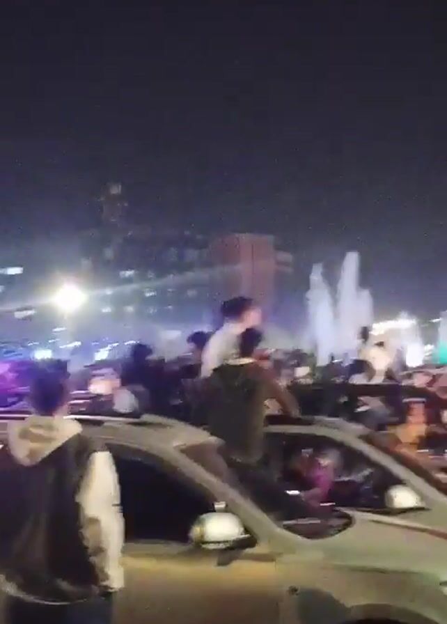 The video captures a vibrant nighttime scene with people celebrating in and around cars. Several individuals are standing on the roofs of the vehicles, while others are on the ground. The environment includes a public space with illuminated fountains in the background and a tall monument visible in the distance. The scene is bustling with activity, suggesting a celebratory atmosphere.
