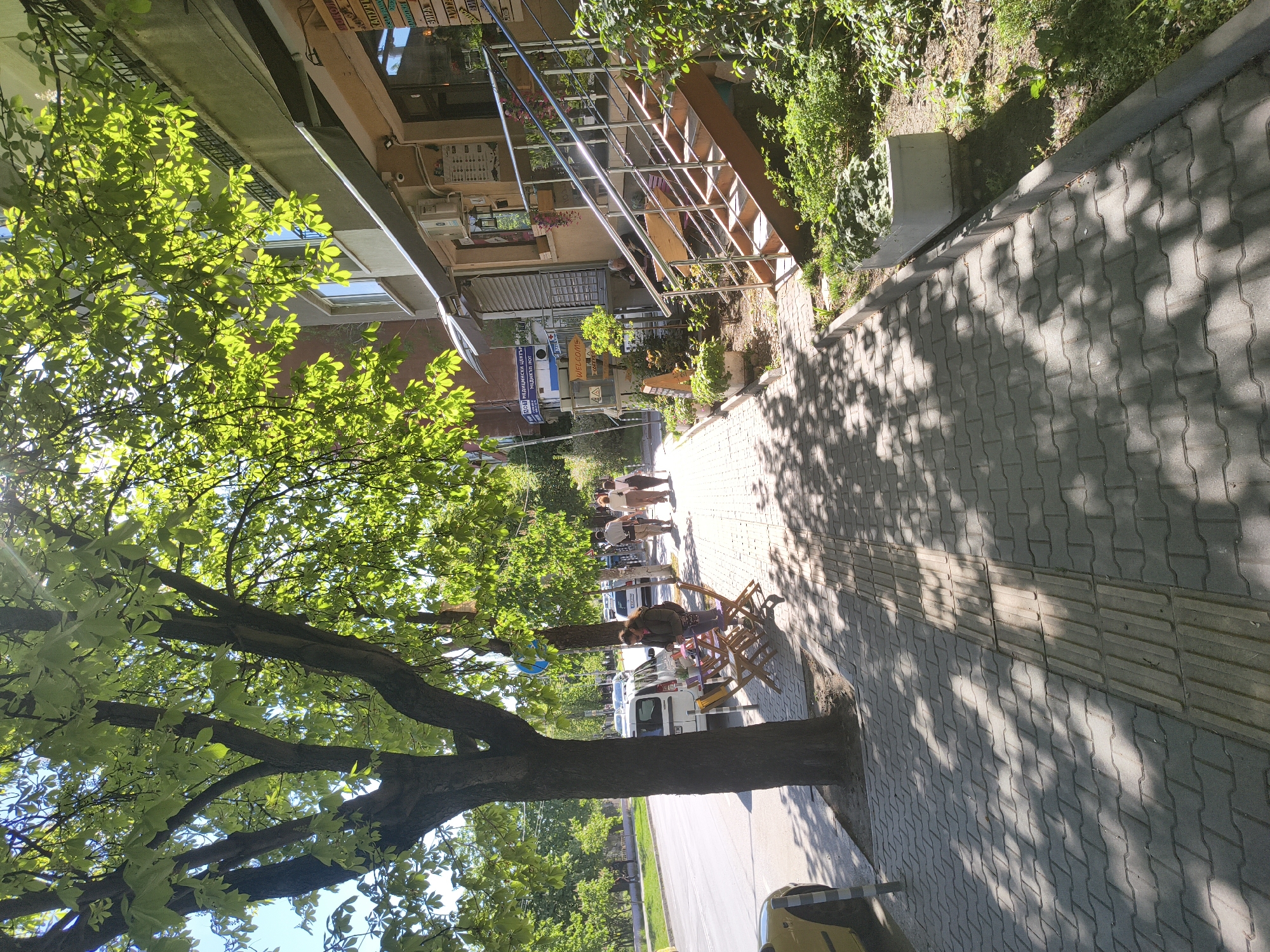 The image depicts a street scene in Sofia, Bulgaria. The viewpoint is from the street looking along the sidewalk. The sidewalk, constructed of interlocking pavers, runs along the side of a building. A mature tree, with bright green leaves, obscures part of the sky and casts shadows on the sidewalk. Several individuals are visible further down the sidewalk. A small white van is parked alongside the sidewalk. A temporary market stand, consisting of a table and chairs, is located next to the tree.