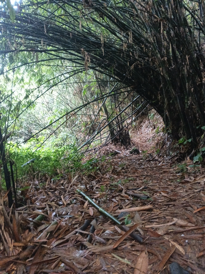 The image displays an unpaved, narrow path traversing a dense bamboo forest in Baglung, Nepal