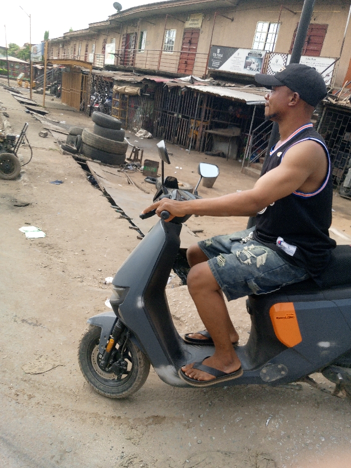 An adult male is positioned on a dark gray electric scooter on an unpaved road in Onitsha, Nigeria