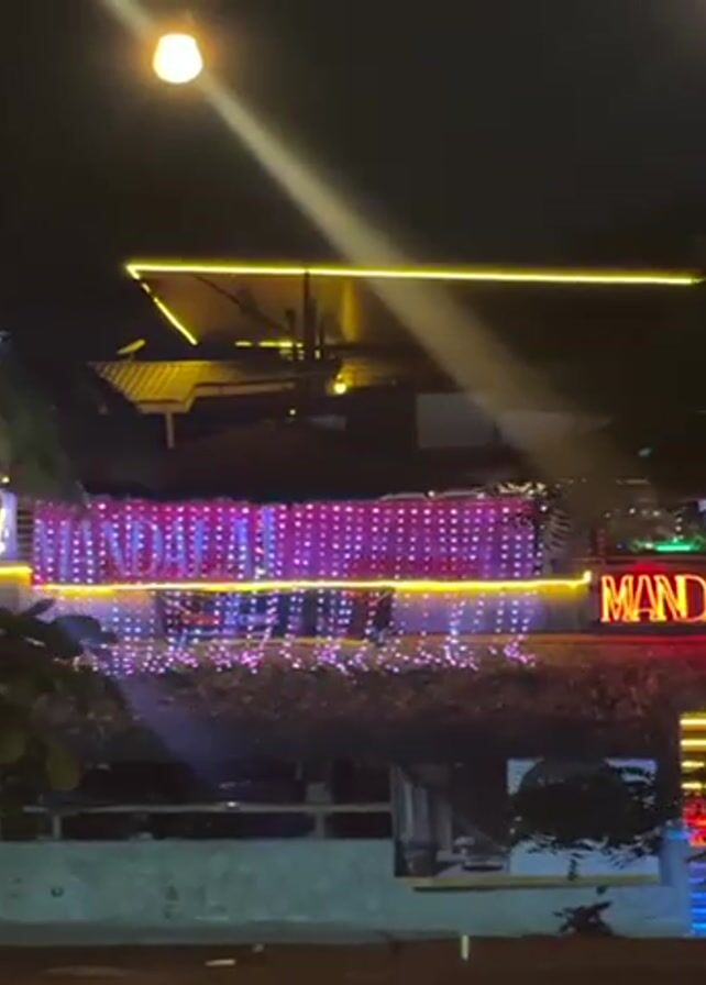A night shot shows an outdoor restaurant called Mandala. The restaurant has two stories with a thatched roof and is decorated with pink and white string lights. The word "Mandala" is lit up in neon orange letters. Yellow lights highlight the eaves of the building above. A streetlamp shines brightly at the top of the frame. Some foliage is visible in the foreground. A song is playing in the background.
