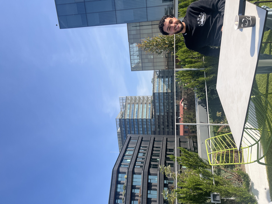 An outdoor rooftop terrace in the 22@ district of Sant Martí, Barcelona, Spain, is depicted on a clear, sunny day. A light-skinned adult male with dark curly hair and a beard is seated at a rectangular, light-grey table, smiling and looking directly at the camera. He is wearing a black long-sleeved sweatshirt with a white graphic featuring three stylized vehicles and stars, paired with blue jeans. On the table to his right, a white disposable cup with a black cat-face design contains a brown liquid with a small white object floating inside. An empty bright lime-green metal chair with a slatted, organic back and seat design is positioned to the left of the table, resting on artificial green turf. The foreground features white concrete barriers and various green shrubs. In the background, beneath a bright blue sky, several modern office buildings are visible: a dark-colored, multi-story building with terraced vegetation on the left, a multi-story glass office structure with a visible external grid system in the center-background, and a tall, reflective glass skyscraper on the far right. Distant red-tiled rooftops of smaller buildings are visible between the foreground foliage and the modern high-rises.