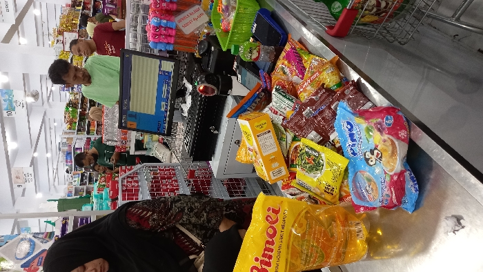 At a grocery store checkout, a variety of items sits on the conveyor belt. Notable products include a bottle of Bimoeli cooking oil, packages of instant noodles with colorful wrappers, and boxes of unknown food products. A cashier in a green shirt stands behind the checkout, presumably scanning the items. A customer, partially visible, is positioned in front of the conveyor belt. Shelves stocked with products stretch into the background, suggesting a well-stocked store.
